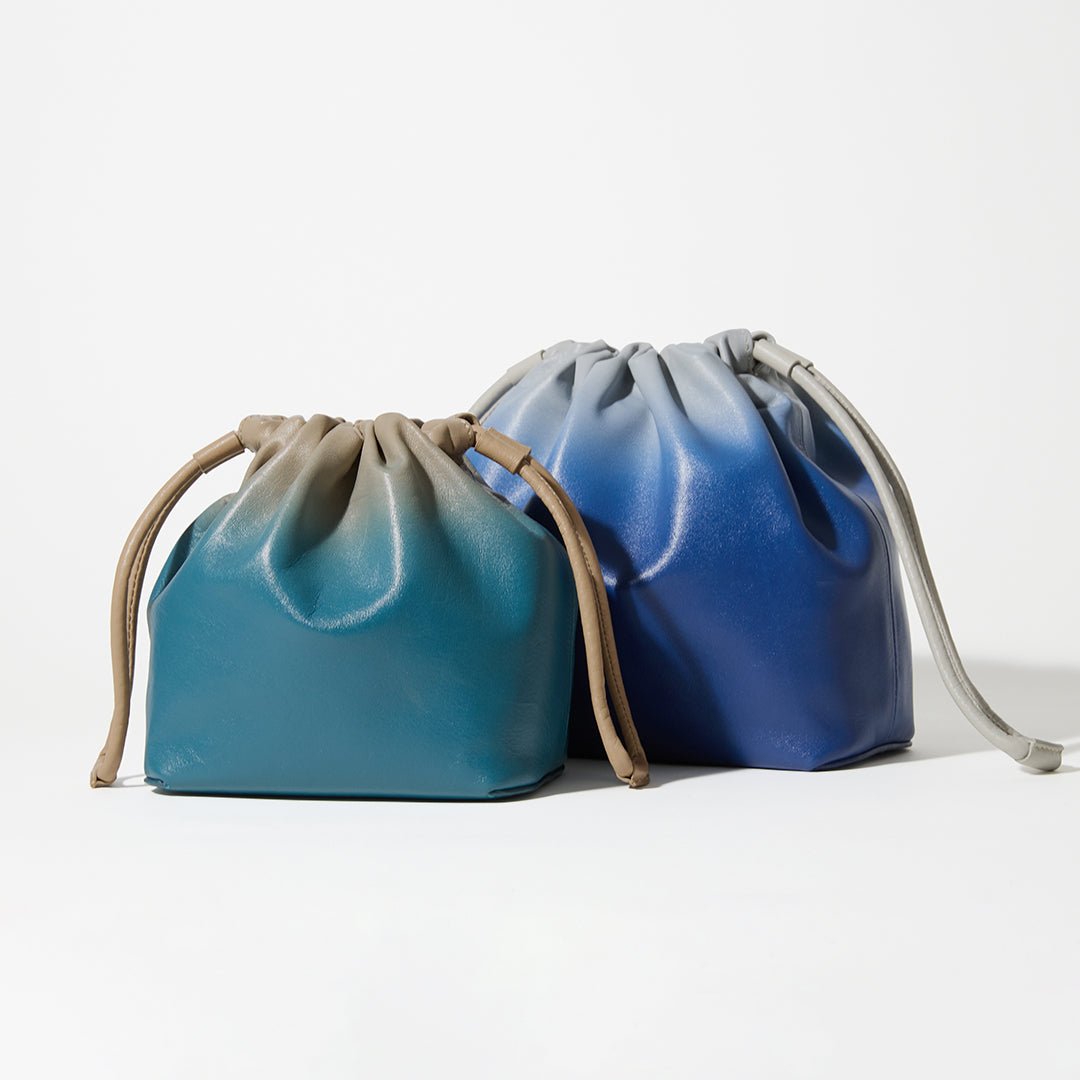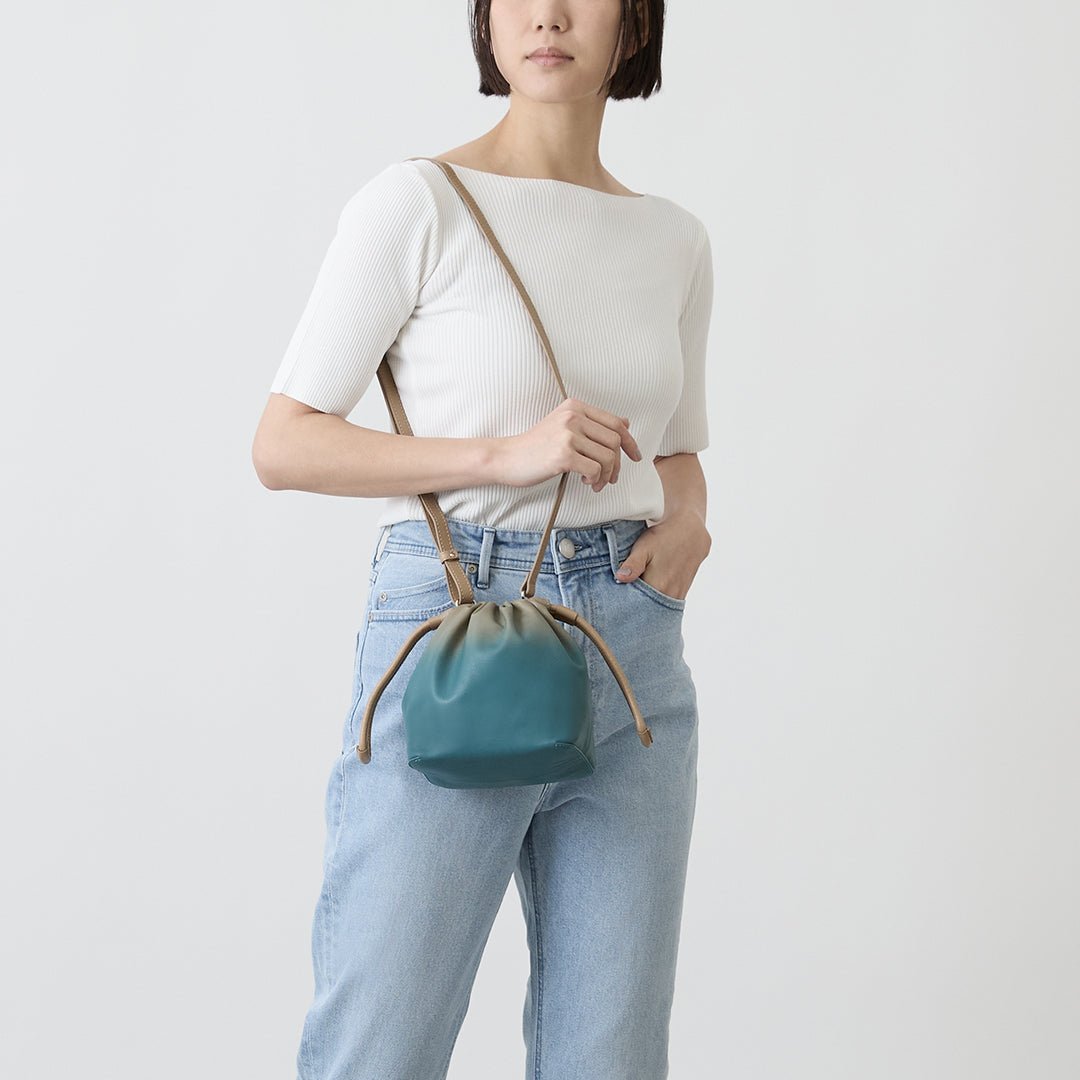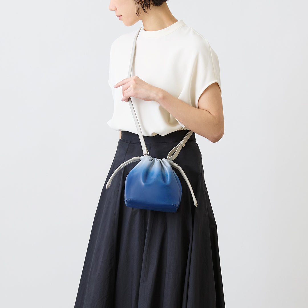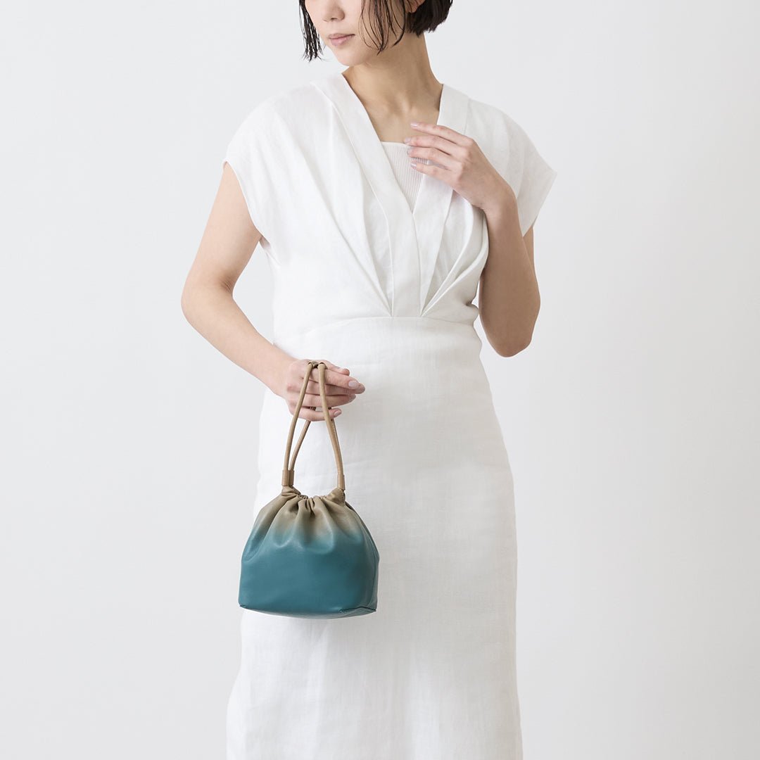 The Nature concept series expresses the beautiful scenery of countries around the world. The lush early summer sky and the sea shimmering in the sunlight. The delicate colors produced by nature. which cannot be expressed in a single color. are reflected in the gradation of leather and made into a 2-way mini shoulder bag with a mode atmosphere. based on the traditional Japanese bag shape. kinchaku.