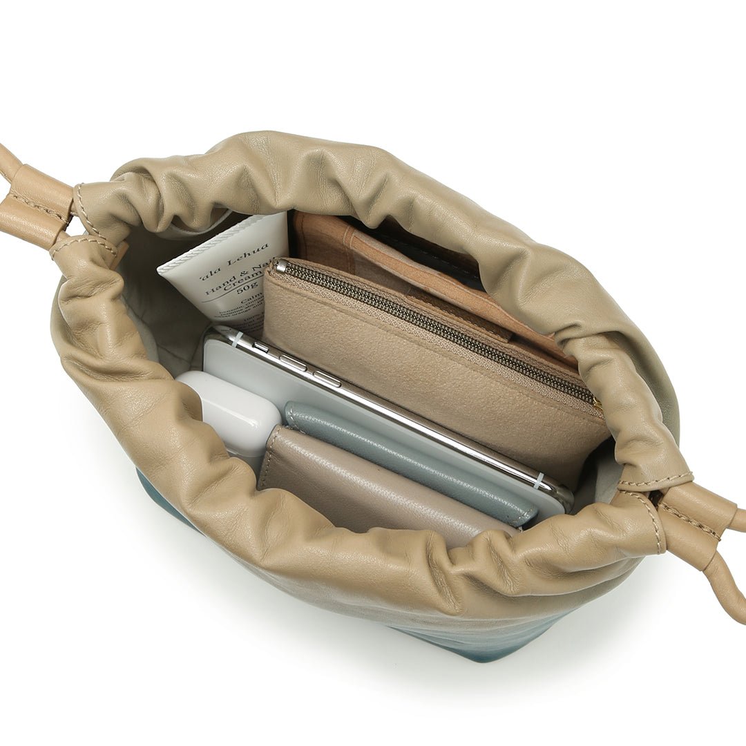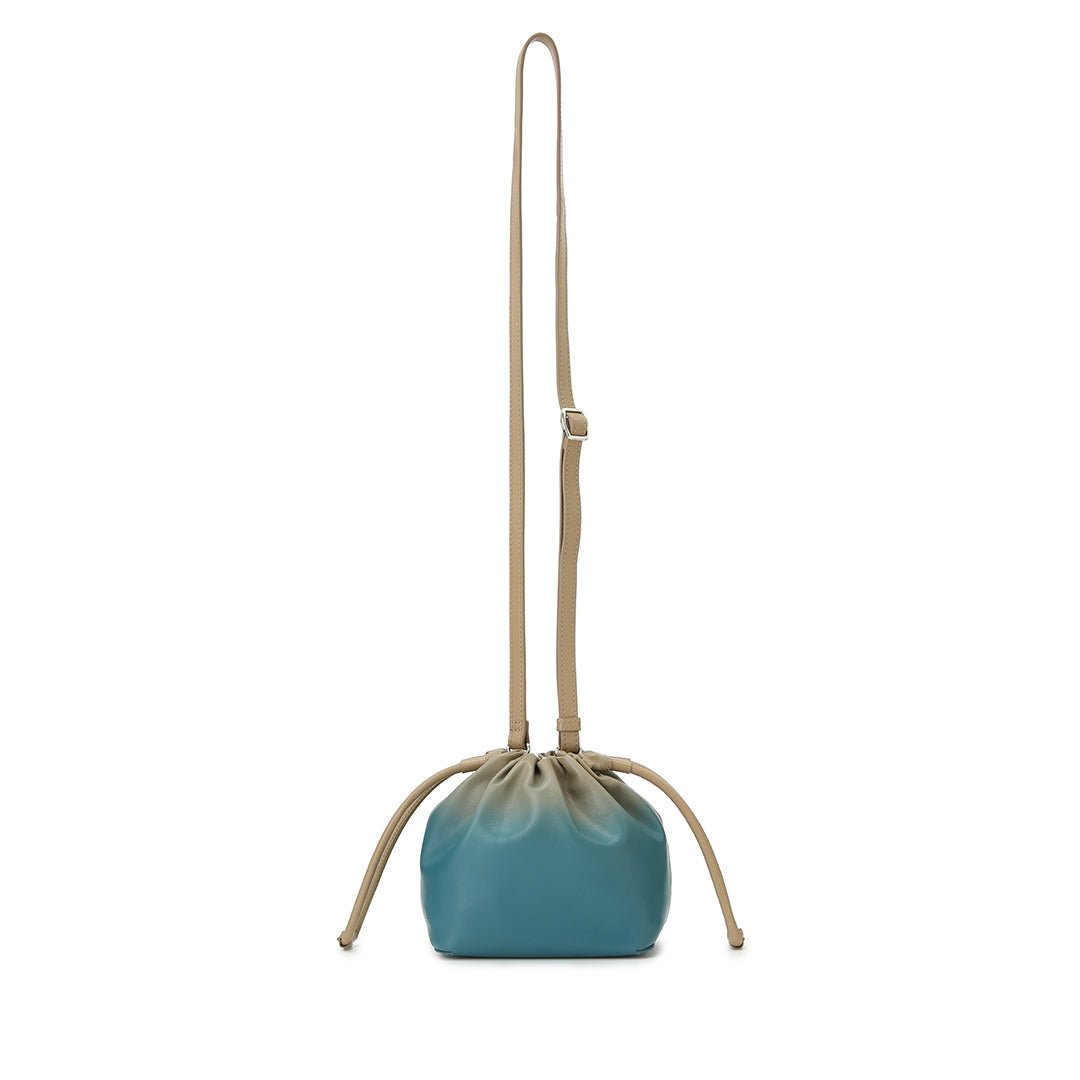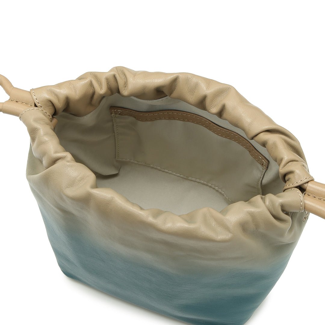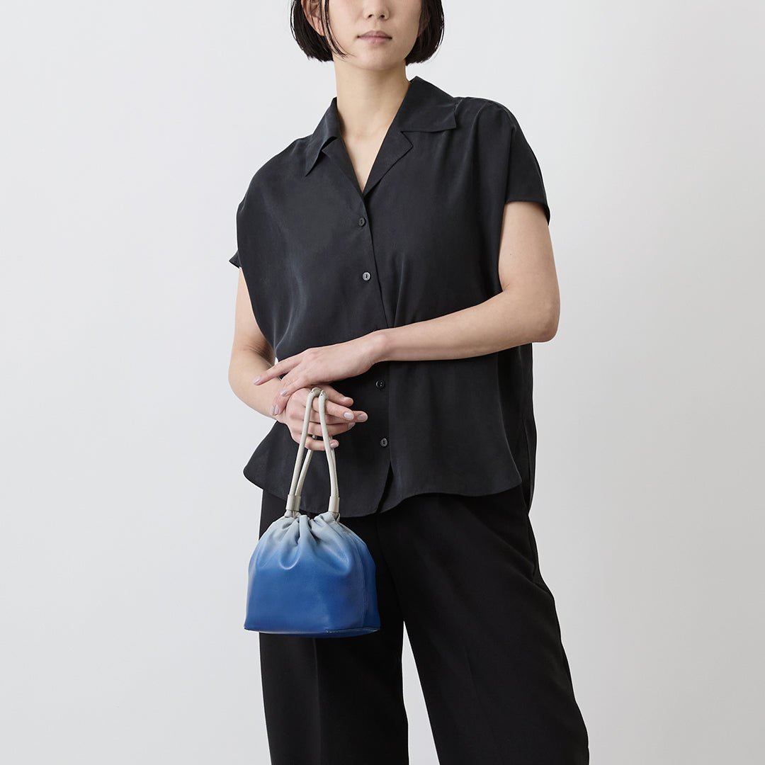 The Nature concept series expresses the beautiful scenery of countries around the world. The lush early summer sky and the sea shimmering in the sunlight. The delicate colors produced by nature. which cannot be expressed in a single color. are reflected in the gradation of leather and made into a 2-way mini shoulder bag with a mode atmosphere. based on the traditional Japanese bag shape. kinchaku.